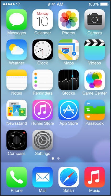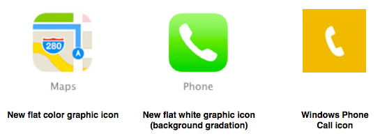 The design style Apple has chosen for the iOS 7 icons follows the current popular software design trend using flat graphics and bright colors. Apple set the trend for mobile device design in 2007 and sadly, now in 2013, they are following design trends. They have attempted to create their own version of flat icons, by using simple flat color graphics on flat backgrounds or backgrounds with slight gradations. This new design direction can be very interesting and differentiating, but they kept their solid white graphic icons for apps like Mail, Phone, and the App Store. The only thing that distinguishes the flat white icons from Microsoft Mobile icons are the rounded corners and slight gradations on the backgrounds. The new suite of iOS 7 icons are a hodgepodge of disjointed graphics, colors, execution quality, and innovation.